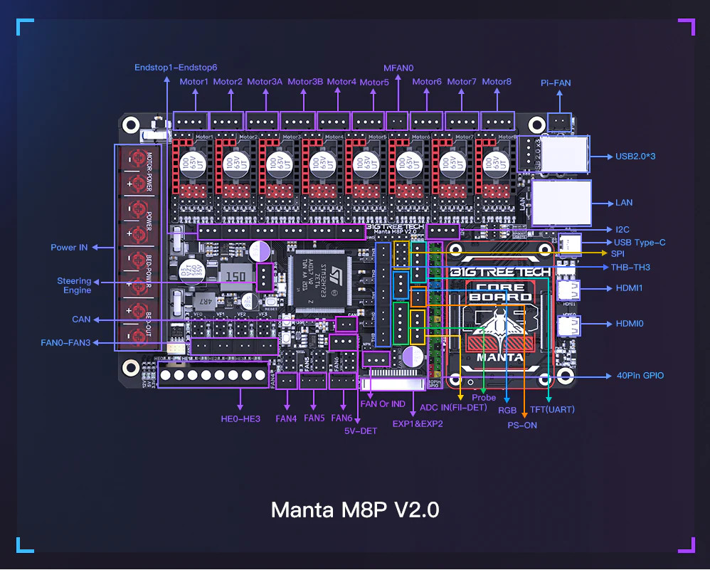 The BTT Manta M8P V2.0 is an 8 motor controller, 32-bit printer motherboard for the Klipper firmware. It is a space and cost-efficient solution compared to using a separate Raspberry Pi, as the motherboard features a board-to-board mount for CM4/CB1 modules. It's an excellent choice for Voron V2.4, Trident, or VzBot 3D printers.